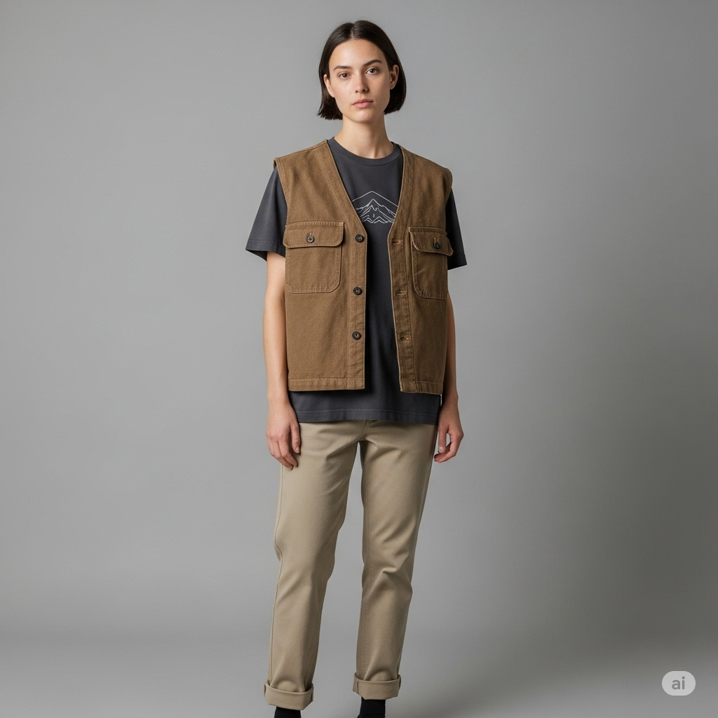 Setelah lapisan dasar, tambahkan outer seperti rompi atau shirt lengan pendek. Kamu bisa memilih outer berbahan ringan seperti Nylon Crinkle Ripstop karena memiliki tekstur menarik, tahan robek, dan tahan air. Rompi dengan potongan boxy cut (yang agak kotak dan longgar) juga bisa menambah kesan bold tanpa mengurangi kenyamanan.