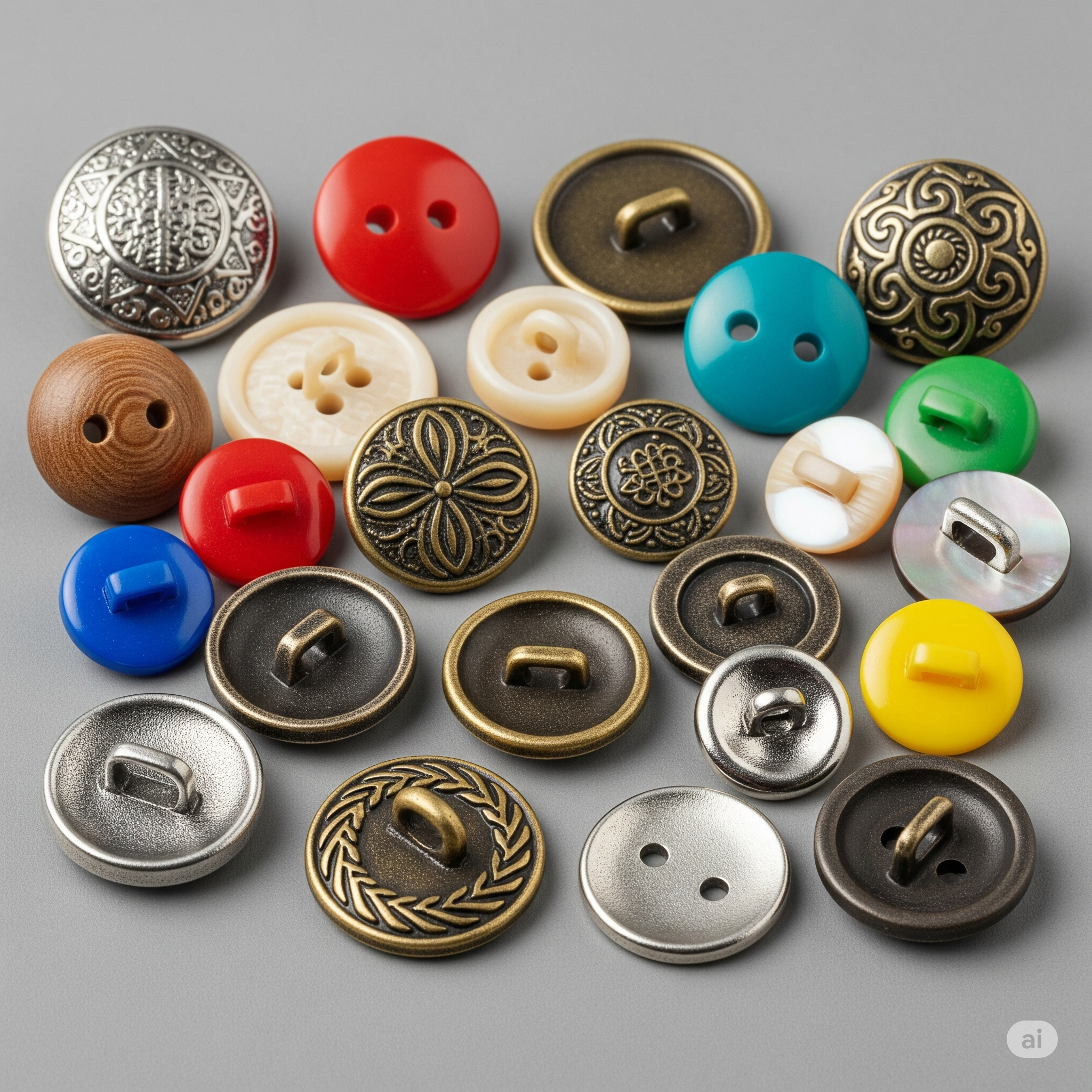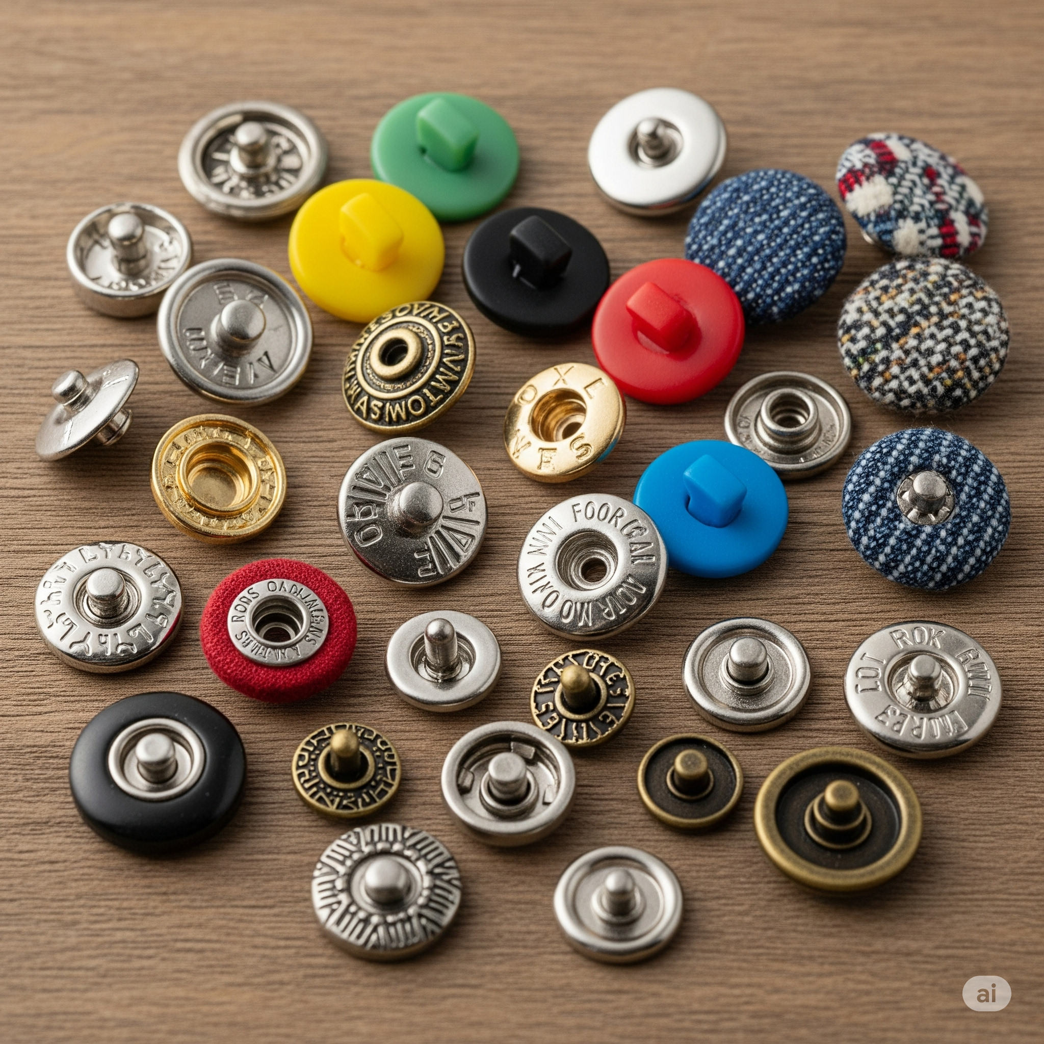 Kancing logam memberikan kesan kuat dan elegan. Biasanya terbuat dari kuningan, aluminium, atau stainless steel. Sering digunakan pada jeans, jaket kulit, dan pakaian dengan gaya industrial atau kasual.