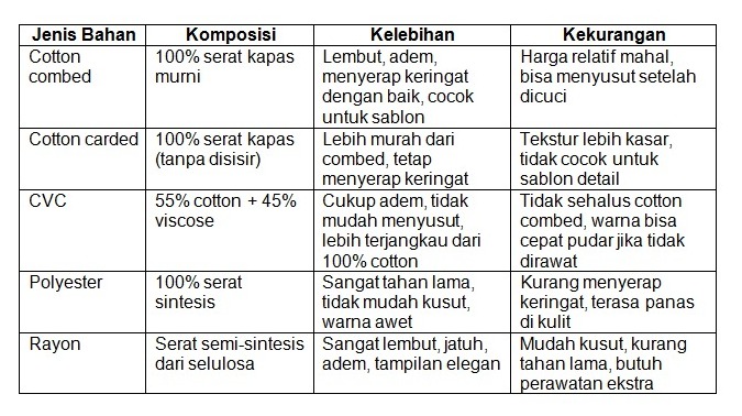 Pernah beli kaos yang keliatannya keren, tapi pas dipakai ternyata terasa panas atau cepet rusak setelah dicuci? Bisa jadi kamu belum mengenal perbedaan bahan kaosnya, karena ternyata bahan kaos itu beragam, dan setiap jenis bahannya sangat menentukan kenyamanan, ketahanan, dan penampilan kaos dalam jangka panjang loh...