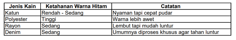 Warna hitam biasanya menggunakan pewarna sintetis seperti reactive dye atau sulfur dye, tergantung jenis kainnya.